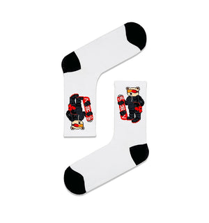 Qorape të bardha të zbukuruara me një dizajn unik arushi me snowboard dhe syze të kuqe.